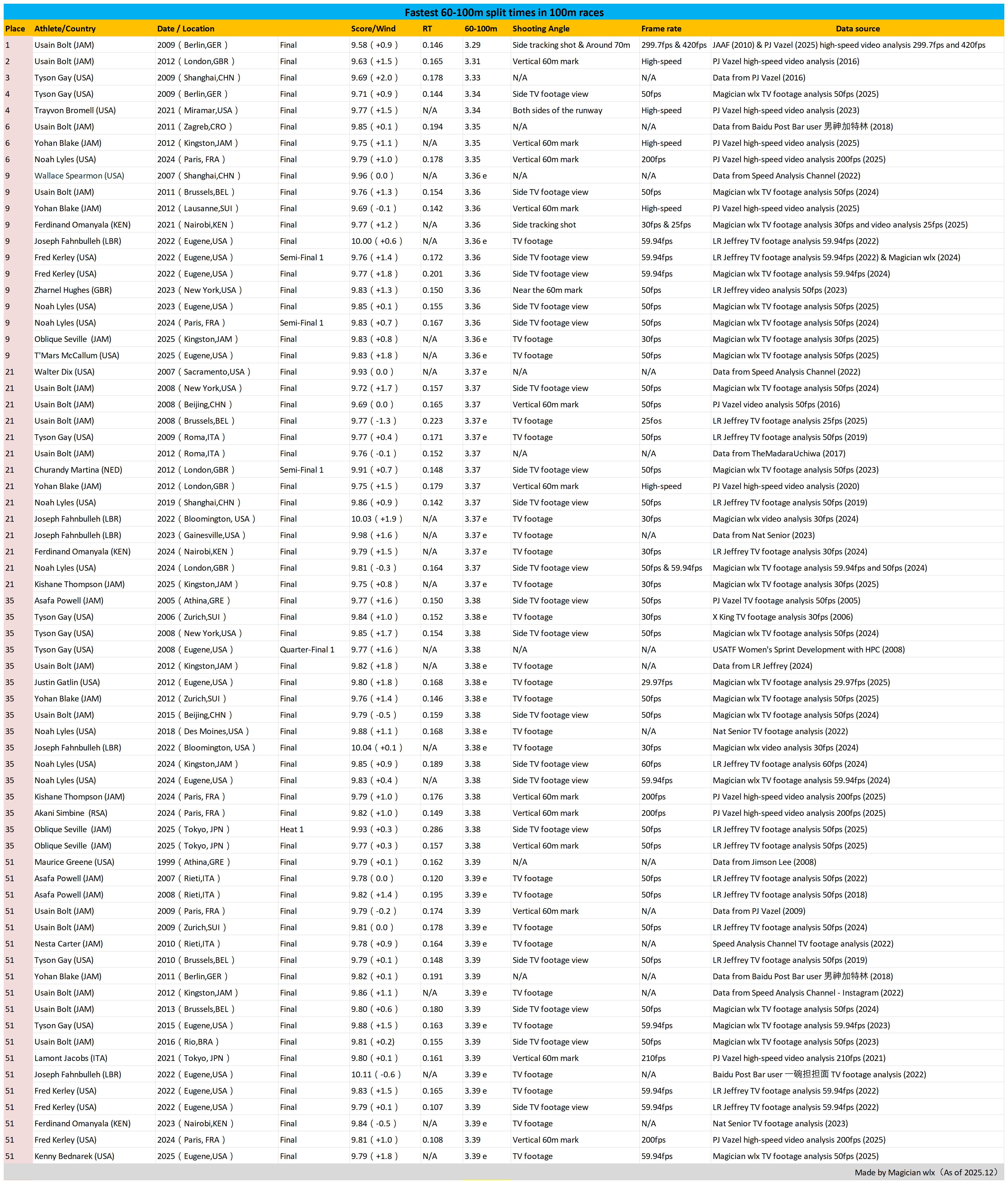 Fastest 60-100m split times in men’s 100m races