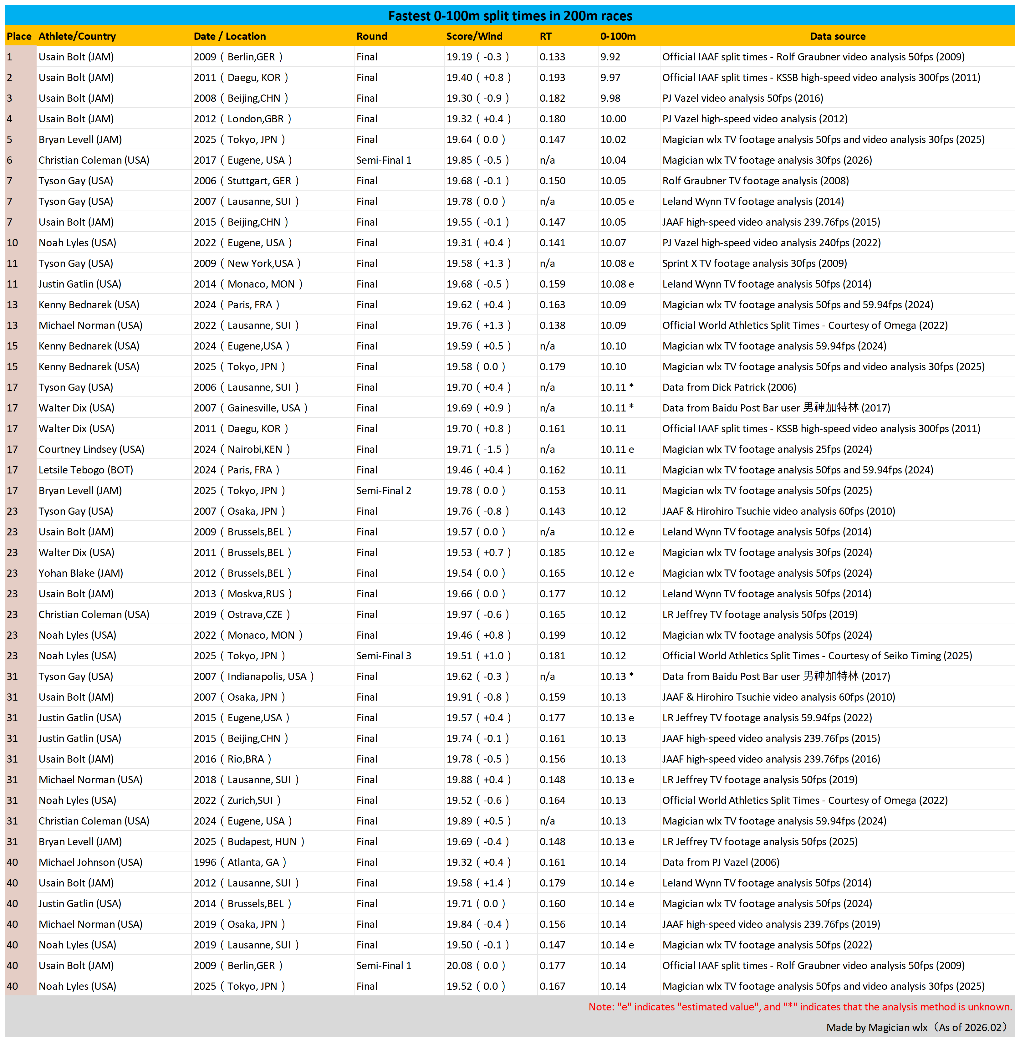 Fastest 0-100m split times in men‘s 200m races